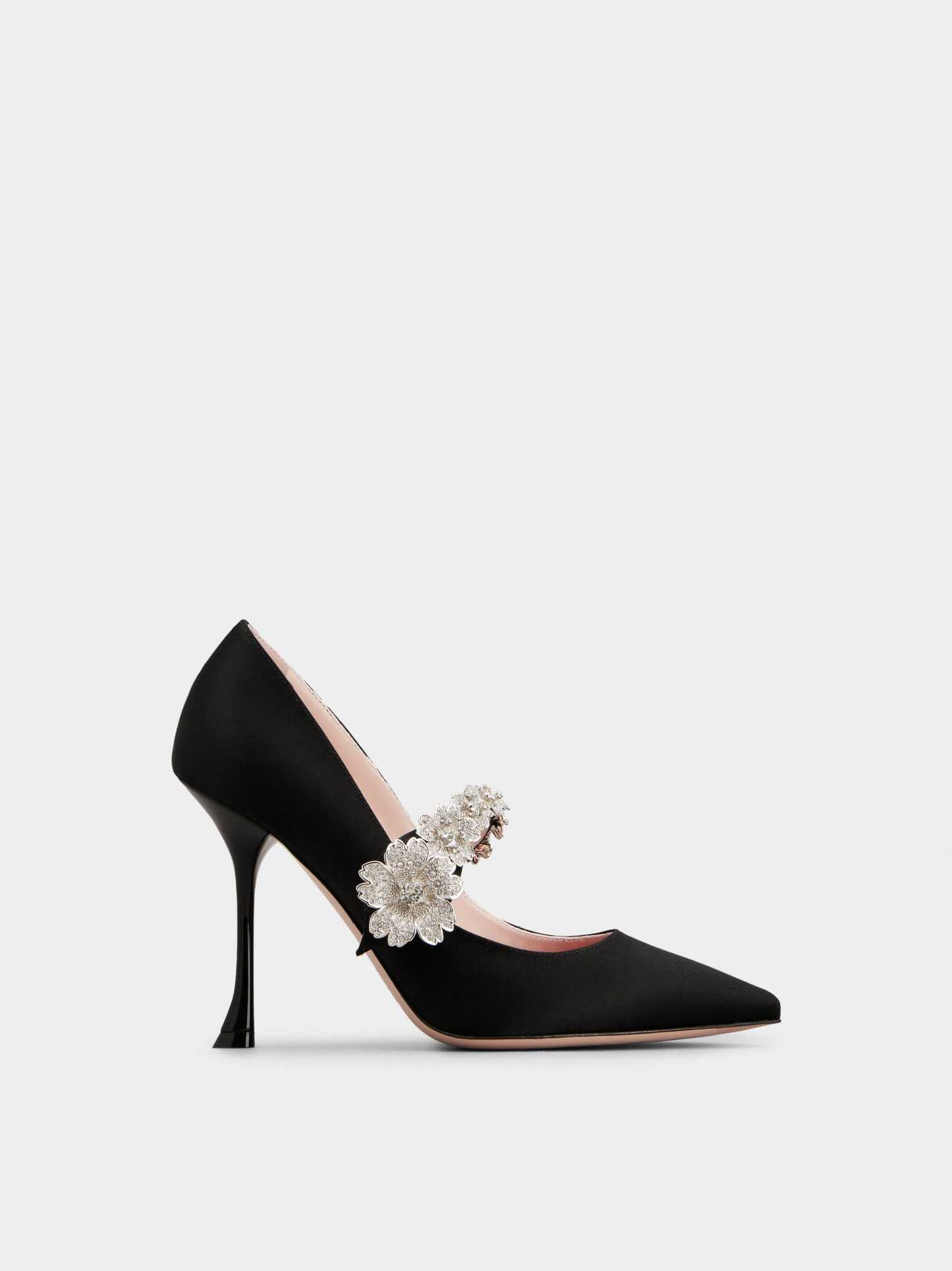 アンティークジュエリーから着想を得た、「ブーケ ストラス」バックル。華麗なクリスタルフラワーを飾ったストラップが印象的なポインテッドトゥのエレガントなパンプスは、サテンにアイコニックなハートのインソールを合わせたジュエルシューズです。