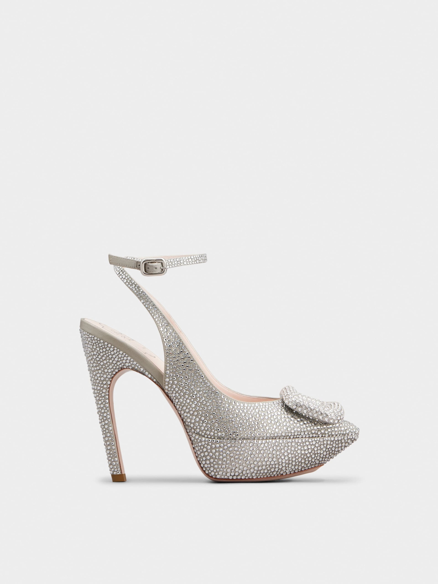 ストラスを散りばめたサテンにアイコニックなドーム状のバックルを飾った、プラットフォームパンプス。エレガントなアンクルストラップ、滑らかなカーブを描くアイコニックなヒールをセットしました。グラマラスな魅力あふれる、フェミニンなスタイルです。