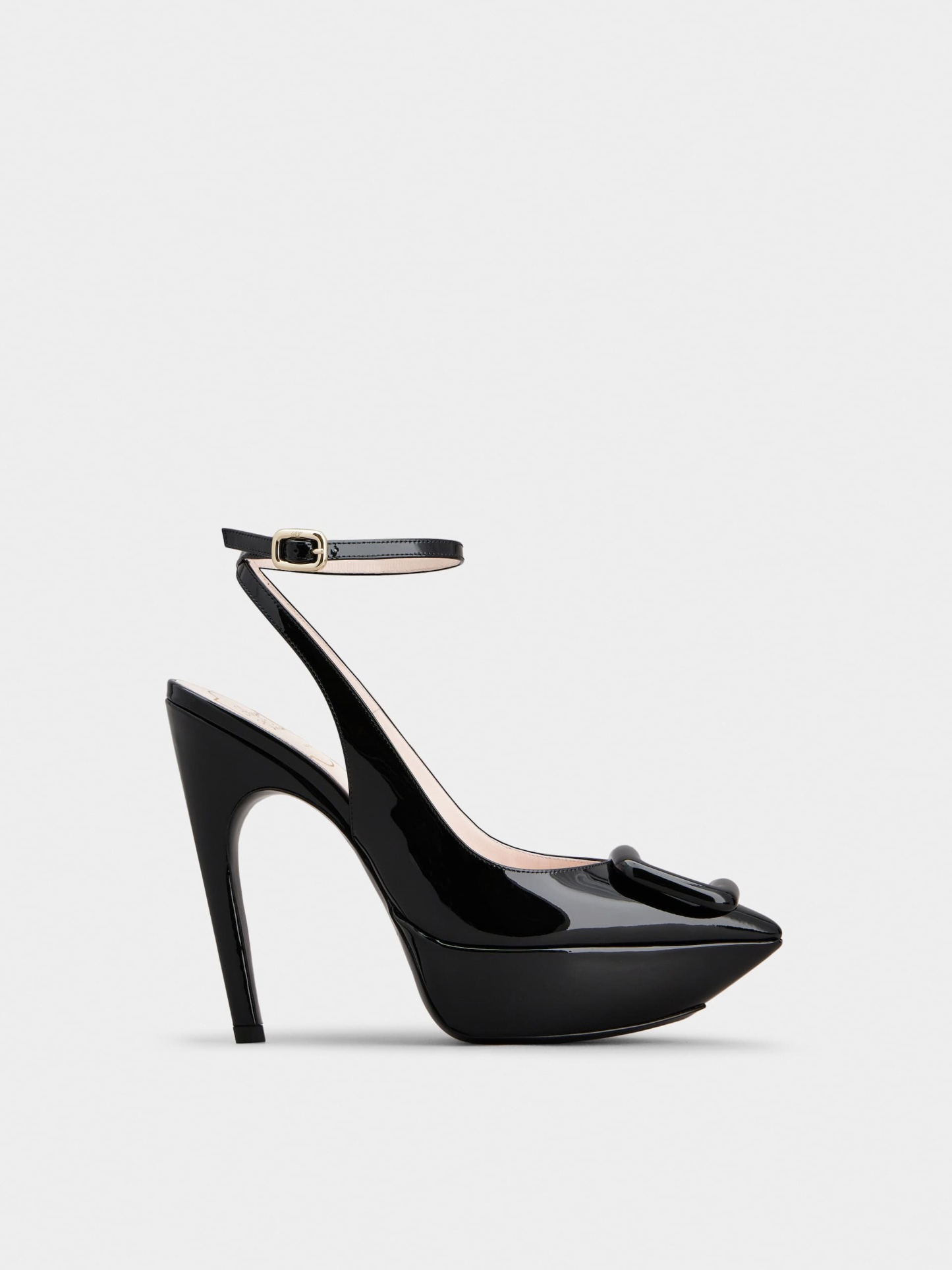 艶やかなパテントレザーにアイコニックなドーム状のラッカードバックルを飾ったプラットフォームパンプス。エレガントなアンクルストラップ、滑らかなカーブを描くアイコニックなヒールをセットしました。グラマラスな魅力あふれる、フェミニンなスタイルです。
