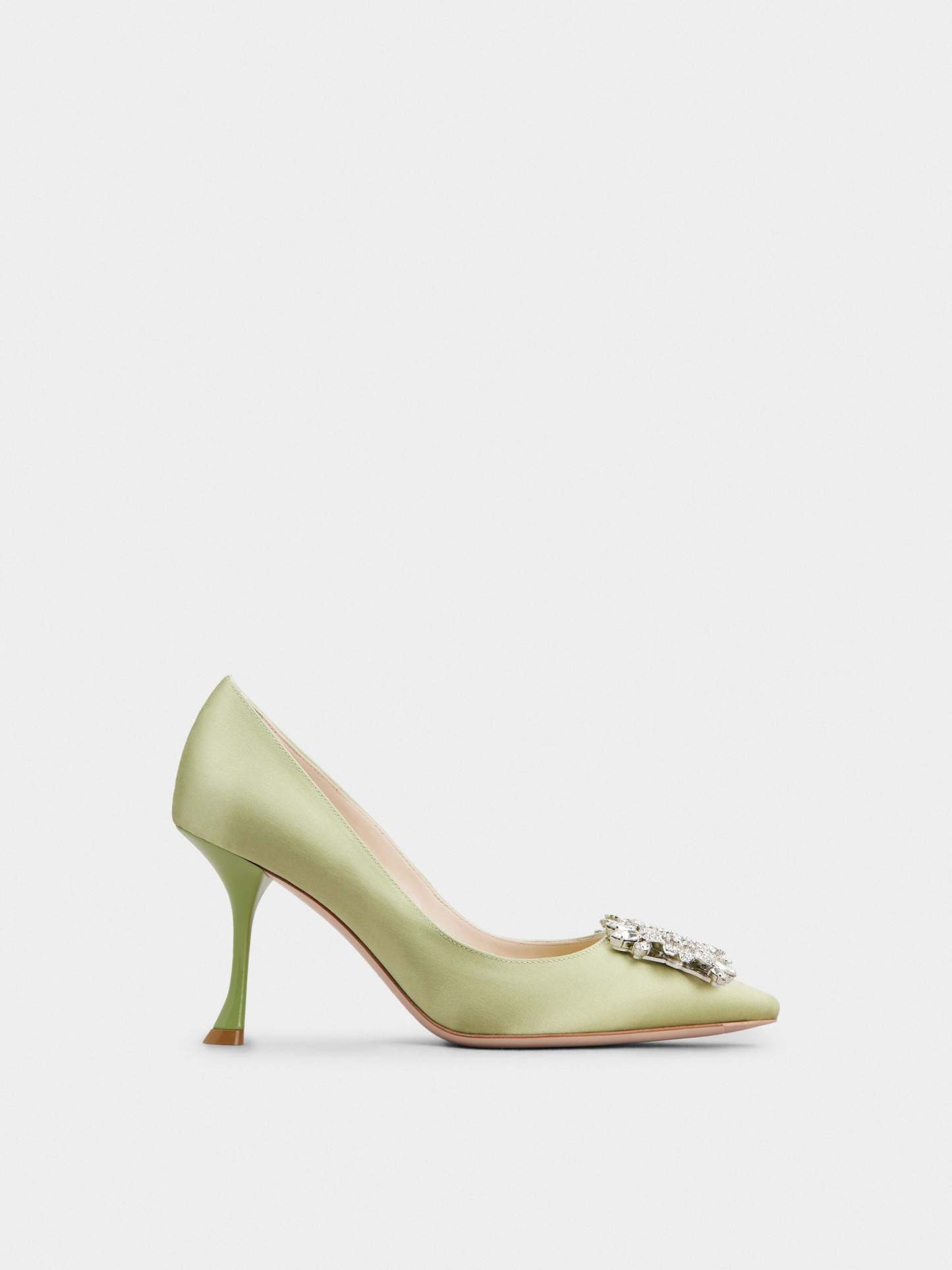 夜の装いを輝かせてくれるサテンの大胆なパンプス。新しいブーケ ストラス バックルがアクセントになっています。バックルはフランスのアンティークジュエリーショップからインスパイアされ、スワロフスキーのクリスタルを1つずつ手であしらいました。洗練された素敵な女性らしさをたたえる新しいデザインです。